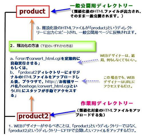 さらに、サーバサイドSHTMLでは、動的なHTMLソースのみならず、静的なHTMLファイルのリアルタイム更新(もしくは、短時間内の更新反映)という御用途にもご利用いただけます。具体的な方法は下記の通りです。 静的なHTMLファイルのリアルタイム更新用のPerl/CGIプログラムのファイル名をここでは、convert_html.cgiとします。このconvert_html.phpでは、特定のディレクトリー(フォルダー)内(「ディレクトリーA=『product2』」と呼びます。作業用ディレクトリー)にアップされているHTMLファイルを、サーバサイドSHTMLのライブラリを使って、特定のフォルダー(一般公開用のディレクトリー。「ディレクトリーB=『product』」と呼びます。)に一括で出力するプログラムにしておきます。(「サーバサイドSHTML for Perl/CGI」Advancedコースに付属の「特定フォルダー内のHTMLファイルの一括更新プログラムのサンプル」を参考にしていただくといいと思います。)後は、編集・更新したオリジナルのHTMLファイルをディレクトリーA(上記挿絵でいうところの「product2」という名称のディレクトリー)にまとめてアップし、convert_html.cgiを何らかの手段で実行すれば、一般公開用のHTMLファイルが更新されます。convert_html.cgiを実行させる方法(上記挿絵の「2.難読化の方法」に該当。)は、手動が面倒であればcronでもできるでしょうが、頻繁に更新されない場合には、cronの実行頻度に気をつけられないと、サーバに思わぬ負荷をかける場合がありますのでご注意ください。 なお、ブラウザ経由でURLを入力してconvert_html.cgiを実行する場合(= http://お客様サーバ名/〜/convert_html.cgiへのアクセス。上記挿絵でいうところの「『2.難読化の方法』の『b』」)、ディレクトリーB(上記挿絵で言うところの「product」という名称のディレクトリー)やその中のHTMLファイルのパーミッションに注意しなければなりません。websuerに対して書き込み権限を与えなければ動作しませんが、セキュリティ上、好ましくない場合もありますから、一括更新する時のみ、一時的にパーミッションを変更し、すぐに元に戻すなどした方が良いでしょう。 この方式のメリットは、WEBデザイナーの方でプログラムの知識がまったくない方でも、普段どおりにFTPソフトでHTMLファイルを特定のディレクトリーにアップするだけで、cronを使えば完全自動で(convert_html.cgiへ手動でアクセスする場合でも、きわめて簡単な方法で)、難読化が可能だということです。convert_html.cgiのプログラムをプログラマーが一つ準備するだけで、ホームページのデザイナーが負担する作業は、アップするディレクトリーが今まで(=公開用ディレクトリー)と違う(ex. 今まで、「product」というディレクトリーにアップしていたものを「product_for_shtml」とか「prodcut2」にアップする)だけで、その他の特別な作業が一切不要になることです。 なお、この方法を使用する場合、作業用のディレクトリー(=オリジナルのHTMLファイルをアップロードするディレクトリー。上の例で言えば、「prodct_for_shtml」や「product2」のディレクトリー)にあるファイルに、一般の方がブラウザ経由でアクセスできると問題がありますので、.htaccessで、ブラウザ経由ではアクセスできないようにしていただくか、そもそもproduct2というディレクトリーをDocumentRootの下に置くのではなく、ブラウザ経由ではアクセスできないDocumentRootより上に置くようにしてください。ご不明の点は、サポートにお問い合わせください。 |